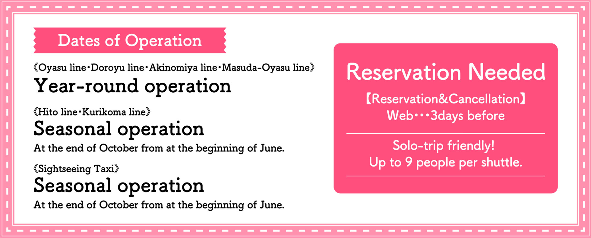 Due to the complete closure of Prefectural Route 310 due to construction, service between(Secret Hot Spring Line) Kawarage Jigoku-Akinomiya will be suspended in 2026.